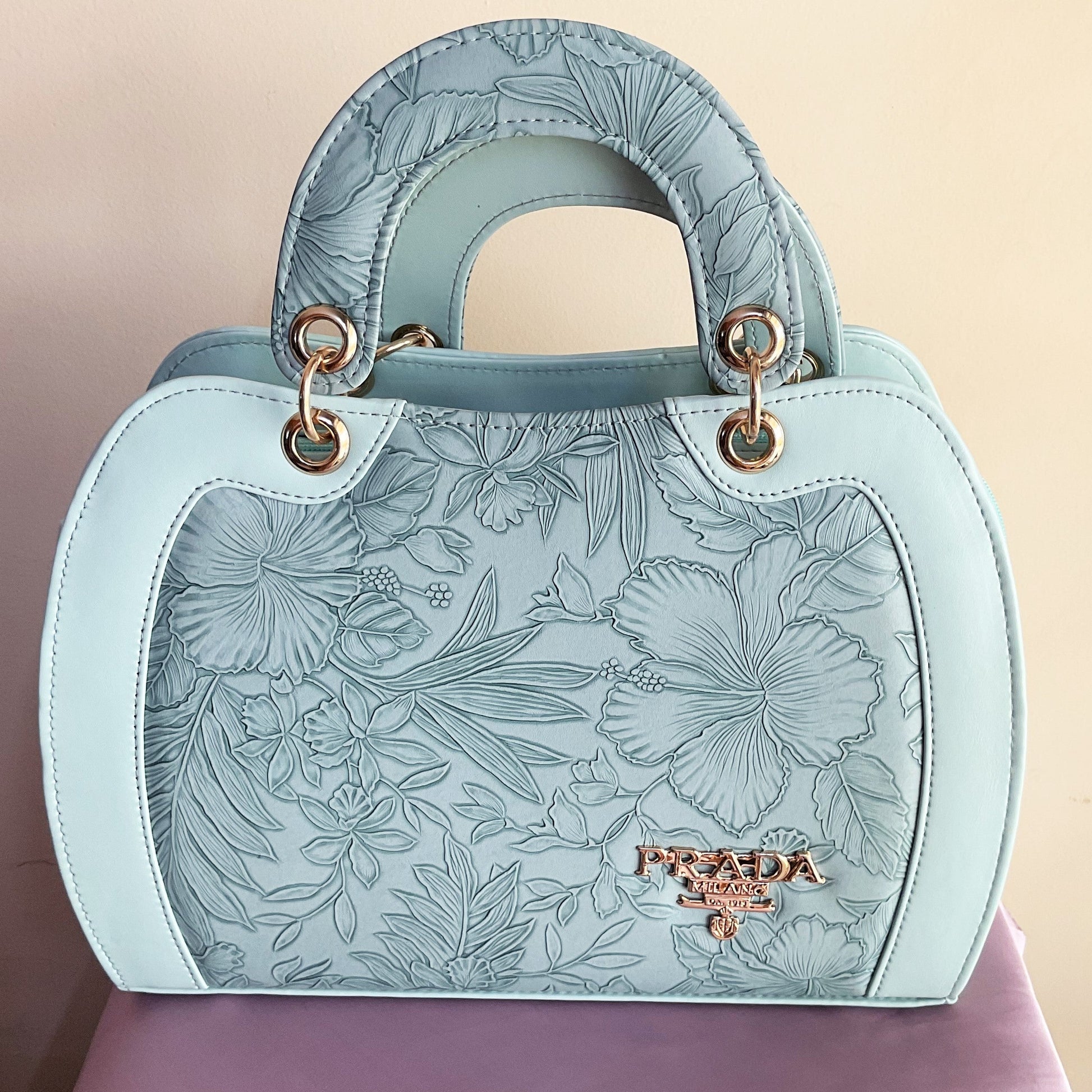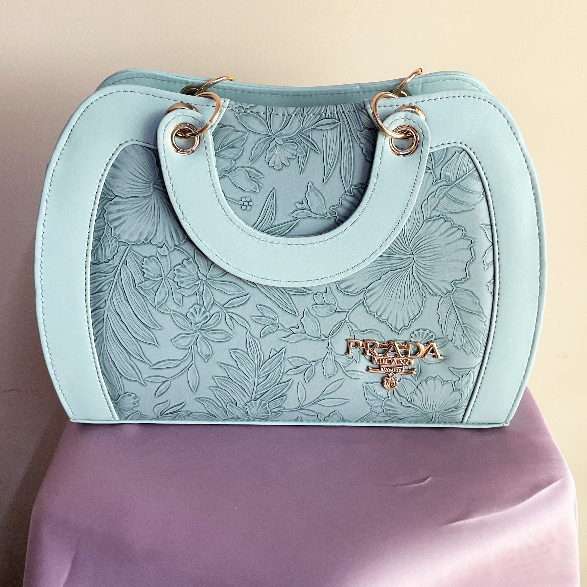- A shoulder strap and two floral handles